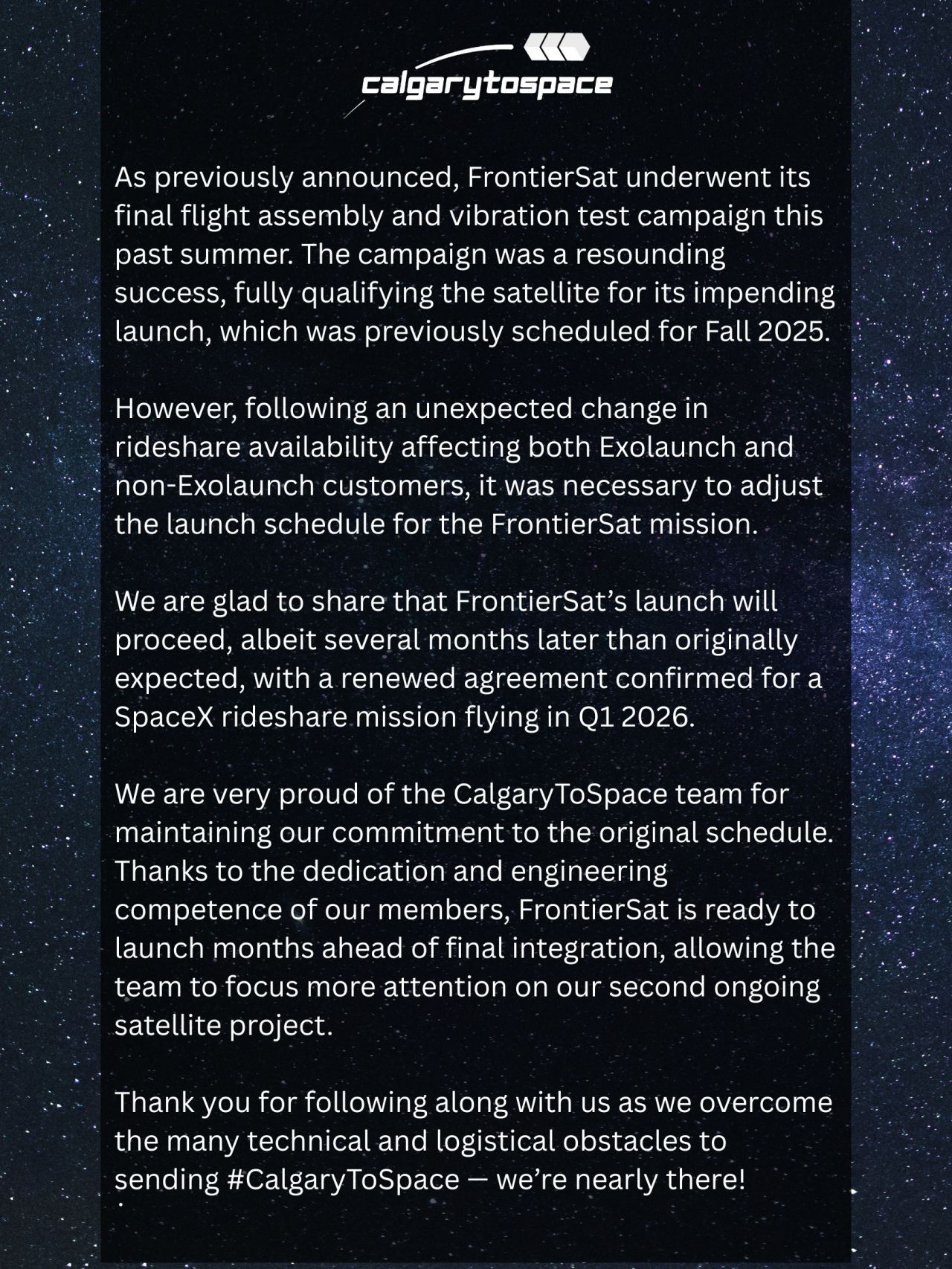 CalgaryToSpace is the latest victim of foreign rideshare reliability, with the launch of FrontierSat being delayed from fall 2025 to Q1 2026.